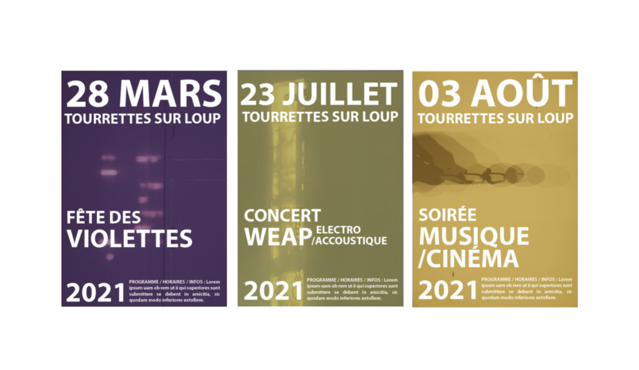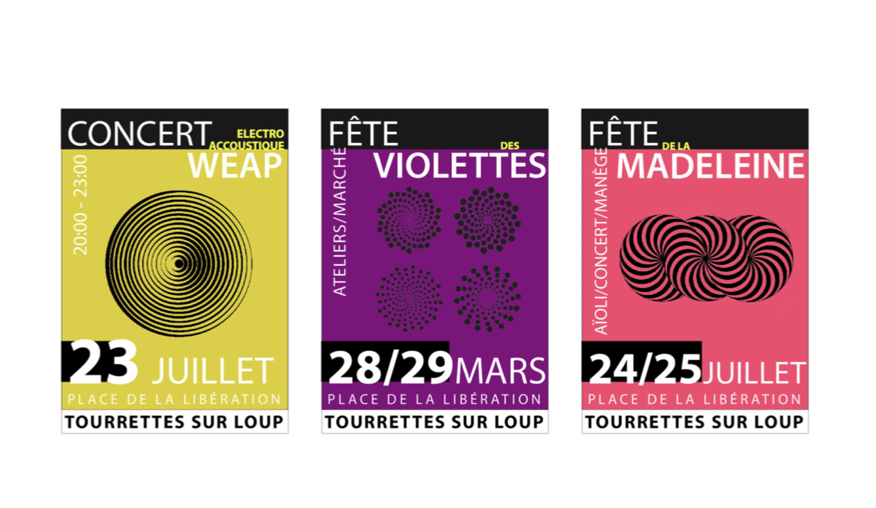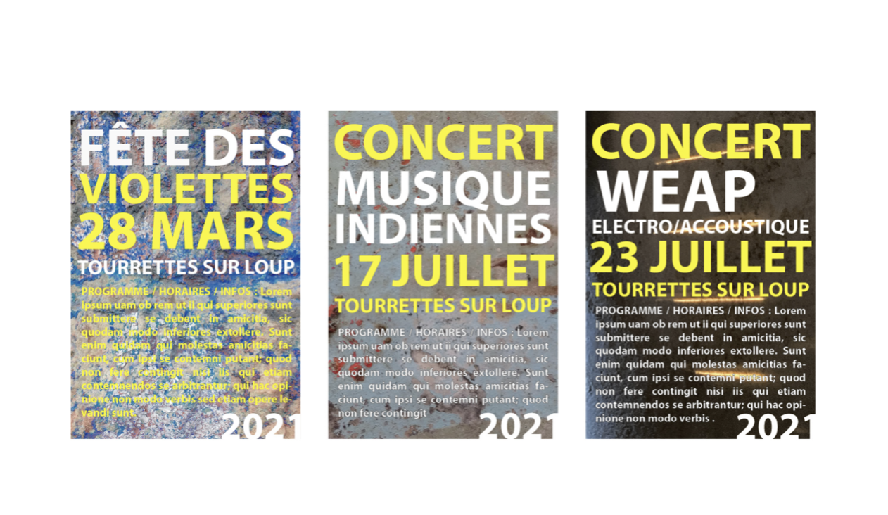 2025 Conception des affiches de l’Espace Muséal et des évènements culturels de la ville de Tourrettes-sur-loup 2023/2024 2021 Autres propositions…
